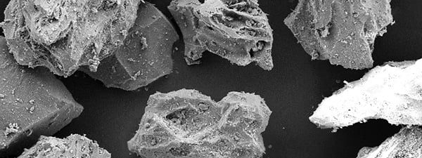 The SEM micrograph below concisely illustrates why pumice is such an effective exfoliant and so widely used for that purpose in skin care and cleanser product formulations. What you’re seeing is the highly-magnified surface of tiny powdered pumice particles. Note the variety, number, and sharpness of the edges—and therein lies the magic.